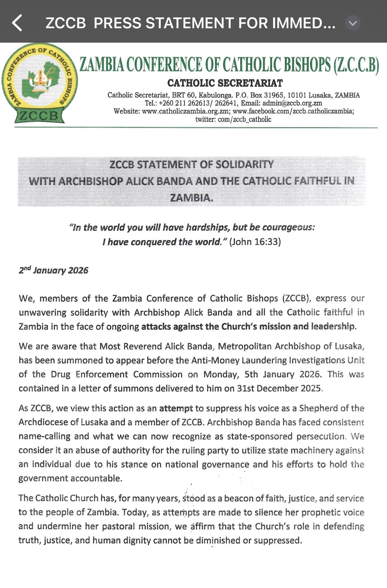 In a statement issued on January 2, 2026, the bishops said they were aware that Archbishop Banda had been summoned to appear before the Anti-Money Laundering Investigations Unit of the DEC on January 5, following a letter delivered to him on December 31, 2025.