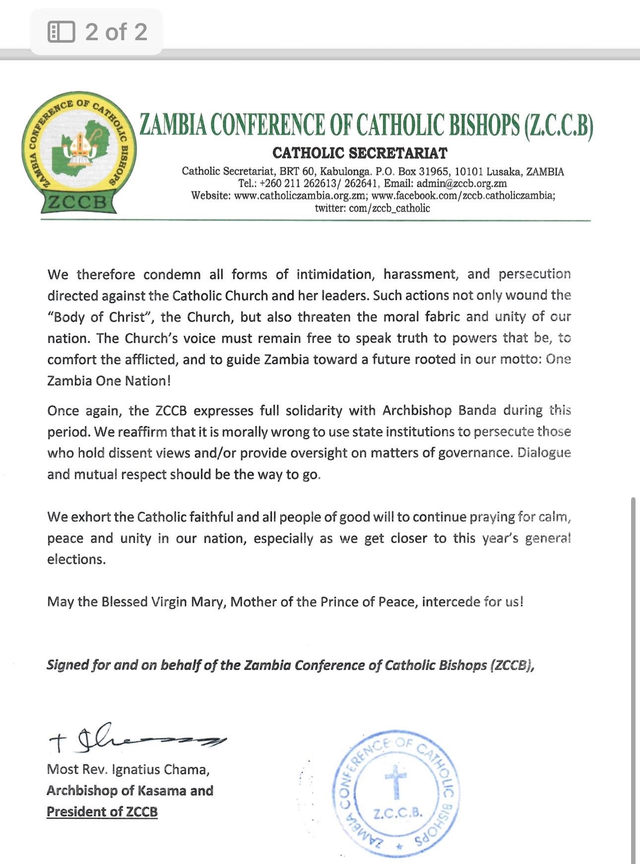 “As ZCCB, we view this action as an attempt to suppress his voice as a Shepherd of the Archdiocese of Lusaka and a member of ZCCB,” the statement reads.