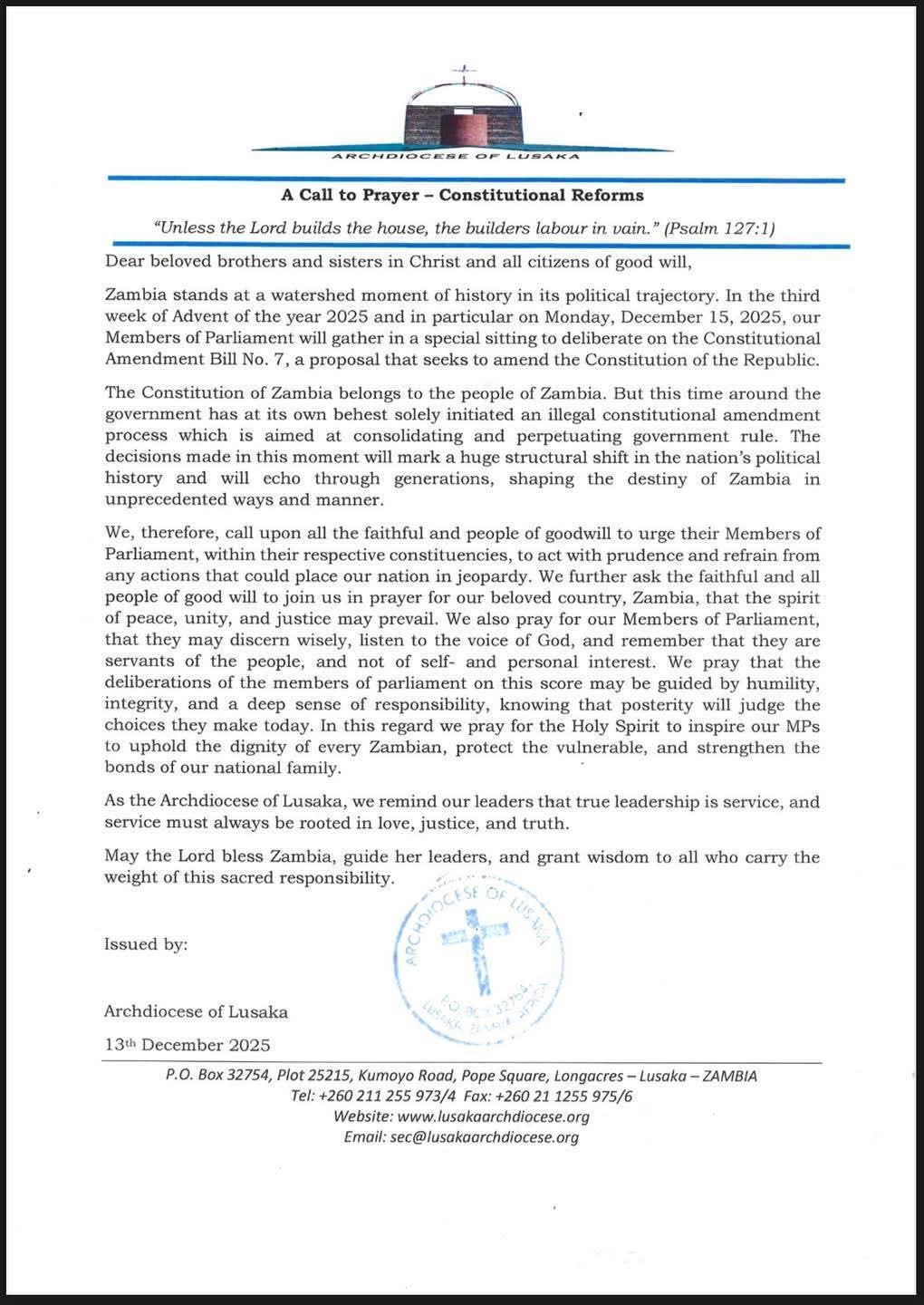 In a pastoral letter issued on Sunday, the Lusaka Catholic Archdiocese called on lawmakers to act with prudence and conscience as Parliament convenes for a special sitting summoned by Speaker Nelly Mutti to consider the Constitutional Amendment Bill No. 7.