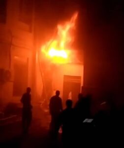 Eyewitnesses said the fire broke out on Sunday evening and engulfed a liquor and wholesale shop along with two neighbouring stores.